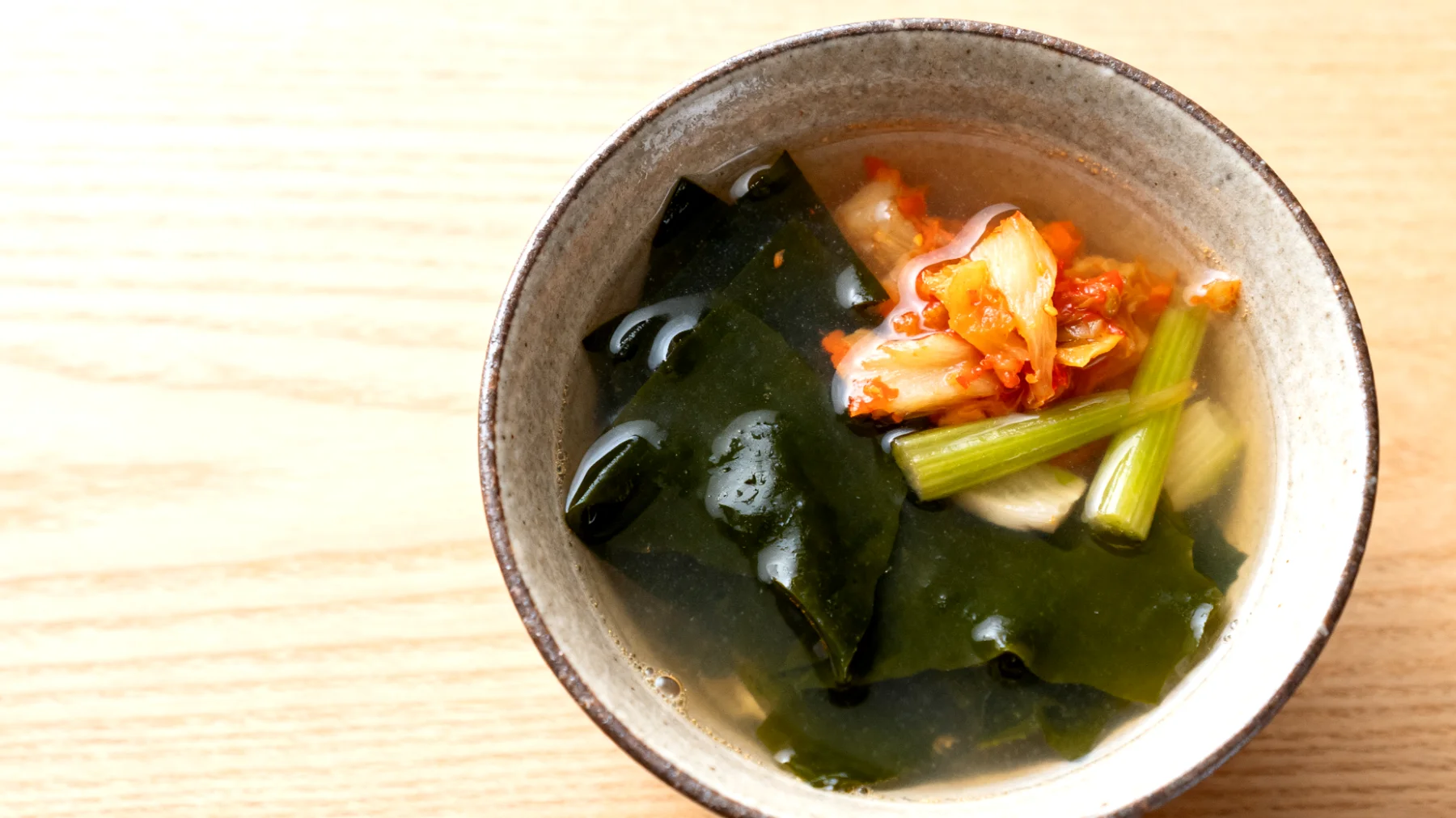 Die Wakame-Algen quellen in der heißen Flüssigkeit innerhalb von Minuten auf. Das fermentierte Gemüse kann direkt zugegeben werden – auch hier gilt: nicht mehr kochen, sondern nur erwärmen.